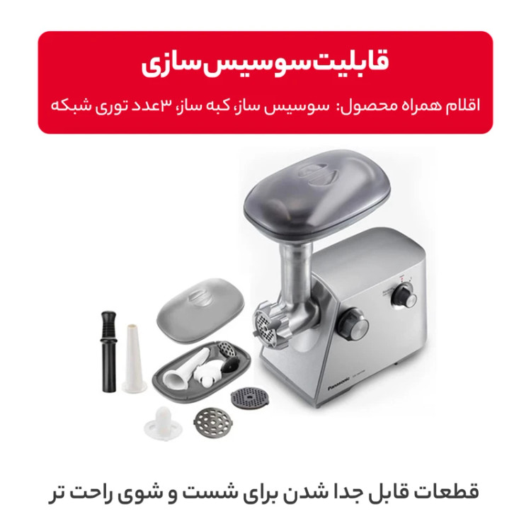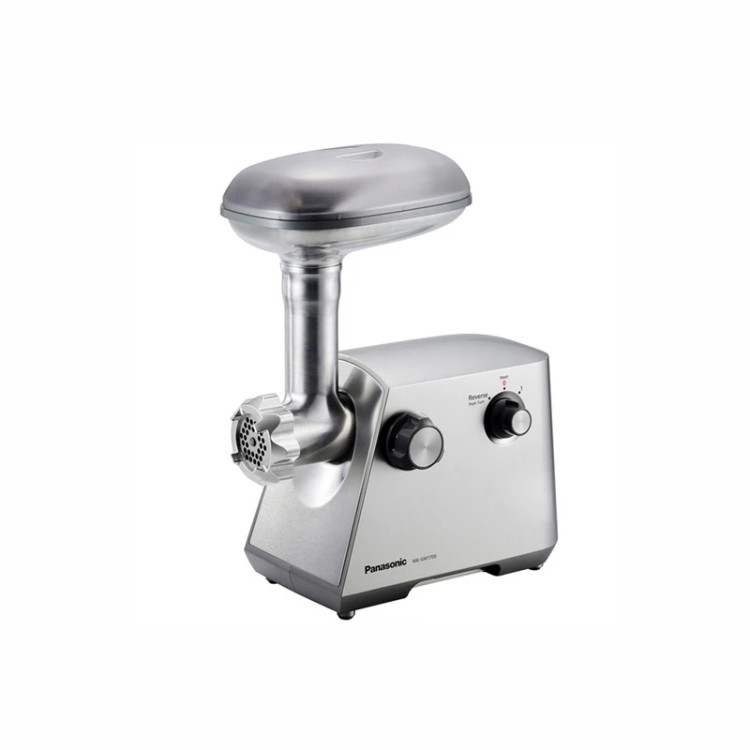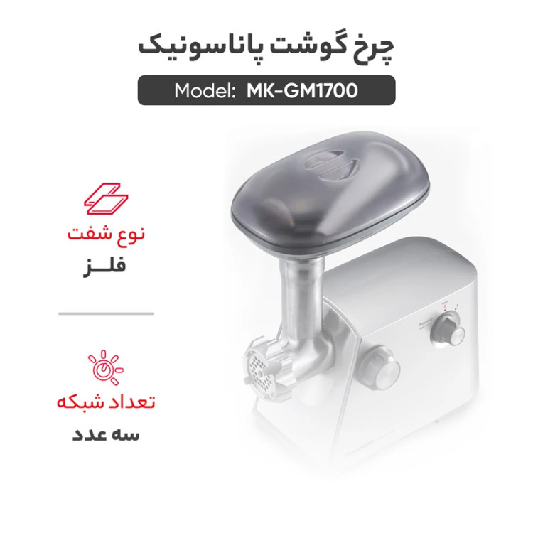 برند:پاناسونیک رنگ:سیلور کشور سازنده:مالزی کارکرد:تک کاره توان مصرفی:1700 وات تنطیمات سرعت:1 سرعته میزان خروجی در دقیقه:2.6 کیلوگرم تعداد شبکه ها:3 عدد شبکه ها:3 شبکه چرخ گوشت (ریز، متوسط و درشت) جنس شبکه ها:استیل جنس تیغه ها:استيل