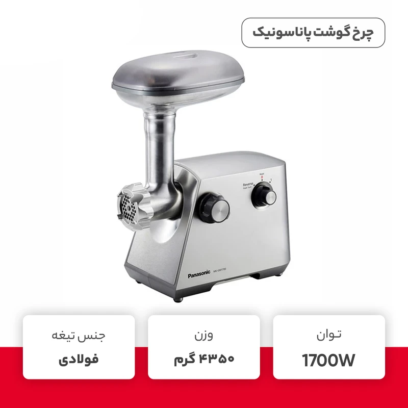 برند:پاناسونیک رنگ:سیلور کشور سازنده:مالزی کارکرد:تک کاره توان مصرفی:1700 وات تنطیمات سرعت:1 سرعته میزان خروجی در دقیقه:2.6 کیلوگرم تعداد شبکه ها:3 عدد شبکه ها:3 شبکه چرخ گوشت (ریز، متوسط و درشت) جنس شبکه ها:استیل جنس تیغه ها:استيل